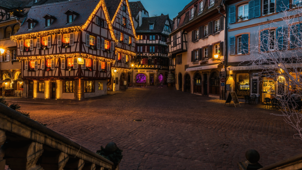 Gjatë dhjetorit, rrugët e qendrës historike ndriçohen me mijëra drita, ndërsa shtëpitë alsasiane zbukurohen me kurora dhe dritare të stolisura. Atmosfera është e mbushur me aromën e verës së ngrohtë dhe biskotave tradicionale.